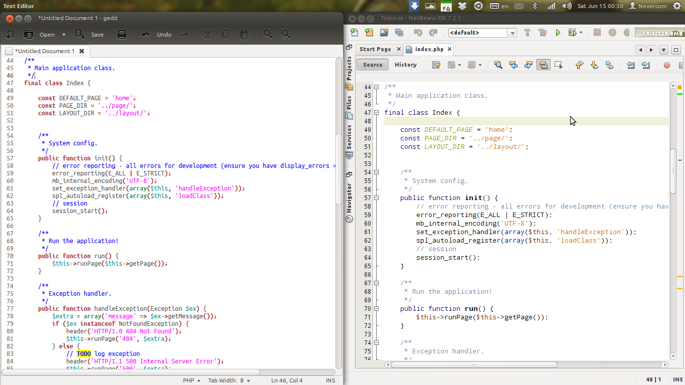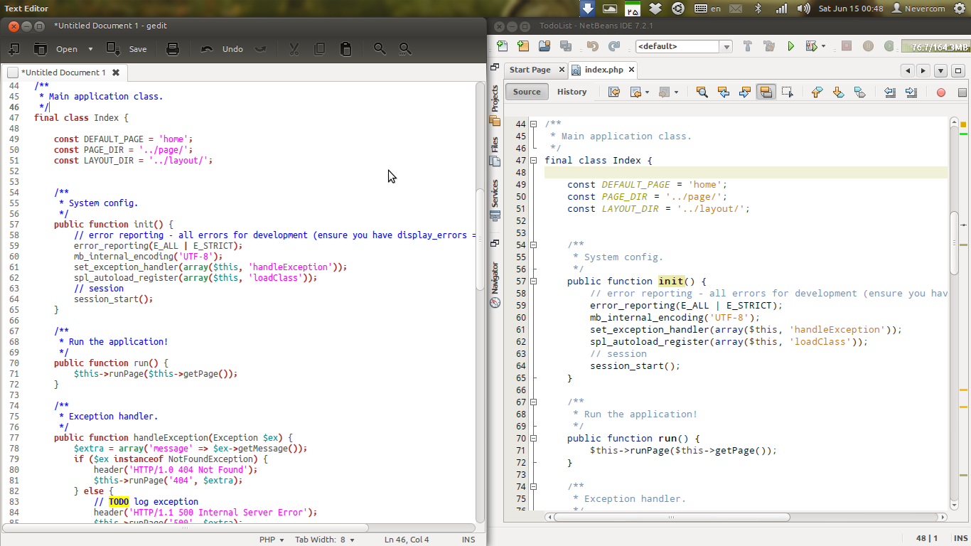 در این تصویر تصویر برنامه ی NetBeans رو درکنار Gedit می بینید (برای دیدن تصویر با کیفیت اصلی، روی تصویر کلیک کنید):
